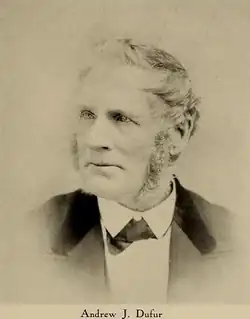 Dufur was born in Williamstown, Vermont, on August 29, 1847. His father was a native of New Hampshire, as were his parents. His father served through the entire War of 1812 and drew a pension for a partial disability. Andrew Jr.'s great grandfather was a French Huguenot, a refugee from France at the time of the historic French Revolution. They were of the aristocratic element whose lives were forfeited through the edict of the leaders of the Sans-culottes, Marat and Robspierre. Andrew J. Dufur, Sr., crossed the plains to California in 1859. His wife, Lois (Burnham) Dufur, was a native of Williamstown, Vermont, descendant of an old and distinguished New England family. She died at Dufur in 1895. She and her son went to Portland, Oregon, via Panama, arriving in April, 1860. They had been preceded by the father, Andrew J., Sr. For 12 years the family lived 6 miles (10 km) from Portland, on a farm owned jointly by father and sons, comprising 800 acres (320 ha). This property they disposed of in 1871. The father of our subject died at Dufur, in June, 1897.