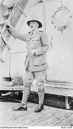 The brigade departed on 22 December; Gillison travelled aboard HMAT Ulysses and made brief stops at Albany, Western Australia; Colombo, British Ceylon; and Aden Colony before arriving at Egypt on 3 February 1915.[3][2] During the journey Gillison helped to censor soldiers' post home, made daily visits to the ship's hospital and brig and conducted Sunday services.[2] In Egypt the brigade undertook training, which Gillison took part in. He also attended lectures, visited Coptic churches, museums and sites of antiquity such as the pyramids and Great Sphinx of Giza.[3][2] Gillison served as secretary of the battalion's officers' mess and treasurer of the battalion fund.[2] He became well liked in the brigade for his singing of comic songs and participation in a boxing tournament.[4]