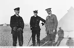 Gillison initially served at a casualty clearing station near to the beach but was later posted to a dressing station and to the hospital ship Seang Choon.[3][2] He worked to console the wounded and bury the dead of all denominations, going as far as reading Catholic services.[2] Corporal J. W. Barr of the 2nd Field Ambulance wrote of Gillison: that "stained by earth and the blood of fellow men, he was grandly eloquent, his clothes and appearance telling us what he did not. They spoke of Christian ministration while he supported the weakening frame from which the soul was speeding; a Christ-like devotion to his fellow-men that found him near them in their last moments".[5] Gillison was responsible for laying out the burial areas at Shrapnel Valley Cemetery which became one of the largest in the area. He laid out four separate areas for men of different units, a system that was maintained until the end of the operation.[6] Gillison was involved in arranging a truce on 24 May to allow burial of a large number of dead lying in no man's land.[5] For his activities in the campaign he was recommended by his superiors for recognition on 20 June 1915.[7] Gillison subsequently received a mention in despatches from General Ian Hamilton, commander of the Mediterranean Expeditionary Force, on 11 December 1915.[8]