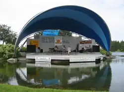 Historically, dogs have not been allowed in the park, nor in neighbouring Dick Bell park. In 2009, the city allowed dogs on a leash as a one-year pilot project. This was to try and solve the "geese problem", which was caused by too many Canada geese in the summer that excrete all over the grass and paths.[1] This rule has since been extended indefinitely. Currently, dogs are allowed on a leash, but "are prohibited from being within five metres of all children's play areas and pools".[2]