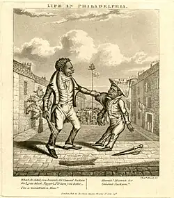 The year before the 1828 U.S. presidential election, pioneering American abolitionist Benjamin Lundy republished news items suggesting that Andrew Jackson had been a slave trader in his younger days, commenting, "I shall be slow to believe that General Jackson would at this day be guilty of carrying on the 'lawful business' of men-dealing, although it is strongly commended by high authority in Maryland. It may be, that the following circumstance gave rise to the suspicion entertained by the Kentuckian. Some years since, a gentleman, residing near the mouth of the Ohio river, informed me that a slave belonging to General Jackson having absconded, was taken up and committed to jail (if I mistake not) in Alabama. The General got word of it, and went for him. After identifying him, he took him out of the jail, tied him to a joist, in a blacksmith-shop, and gave him a very severe flogging. He then took him home. This case has often been related in Kentucky, and possibly magnified so as to give rise to the statement relative to the General's connection with the slave trade."[19] The Jackson papers show that he expended time and effort on the problem of Tom Wid, George, and Osten, all three of whom, at one time or another made an effort to no longer be enslaved under the purview of Andrew Jackson. Historian Mark Cheathem believes George (b. c. 1770) was likely an estate slave inherited by Rachel Jackson from her father and who was once bitten by a snake; despite Andrew Jackson chasing him around for a while he ultimately made it to New Orleans from whence he disappeared.[20]