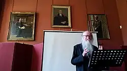 ![]() Louth speaking at St Edmund Hall, Oxford, in 2017 in front of a portrait of A. B. Emden | |
