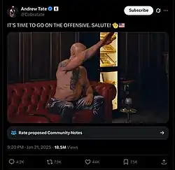 Tate has questioned whether the Nazis were really the "bad guy" in World War II.[69] Tate has performed Nazi salutes, and advocated "bring[ing] the Nazi salute back".[99] In January 2025, after Elon Musk made a salute interpreted by many as a Nazi salute, Tate responded by saying, "we're so back".[100]