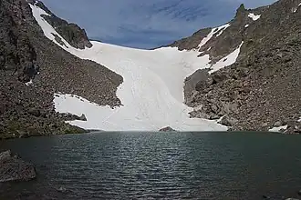 Andrews Glacier is an alpine glacier in a cirque below Otis Peak (12,486 ft (3,806 m)) in Rocky Mountain National Park in the U.S. state of Colorado.[2] The glacier extends from Andrews Pass at nearly 12,000 to 11,700 feet (3,700 to 3,600 m) with some perennial snow extending to Andrews Tarn, a small proglacial lake. When images of the glacier taken in the early 1900s are compared with those of the early 2000s, Andrews Glacier is showing a negative glacier mass balance which indicates the glacier is retreating.[3]