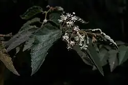 Plants in the genus Androcalva are shrubs or trees and have stems, leaves and flowers covered with star-like hairs. The leaves are simple, often with irregularly-toothed or lobed edges, and with ligules at the base but that are sometimes deciduous. The flowers are bisexual, arranged in cymes opposite leaf axils, with 5 sepals, 5 petals, 5 stamens, and 5 staminodes sometimes with 3 lobes. The fruit is a bristly capsule with five valves, and is covered with star-shaped hairs.[2][3][4][5]