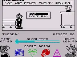 Andy has to acquire money to give to his wife from various sources, as he has already spent his unemployment benefit, while consuming as much alcohol as possible and avoid getting arrested for various crimes (like punching his wife and beating up police officers).[3] Money is assigned to the player in British pounds and kisses are used to control various non-player characters. Running out of kisses or alcohol means that the game instantly ends with a game over.[3] The time is given in the 24-hour clock format (00:00-23:59 and excluding the AM/PM formats) while the days of the weeks are organized from Monday to Friday.