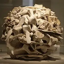 In contrast to other artists who work with the land, most of Goldsworthy's works are small in scale and temporary in their installation.[9] For these ephemeral works, Goldsworthy often uses only his bare hands, teeth, and found tools to prepare and arrange the materials. His process reveals a preoccupation with temporality and a specific attention to materials which visibly age and decay, a view which stands in contrast to monumentalism in Land Art.[11]