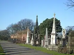 Associated with the cemetery are twelve buildings that are designated by English Heritage as Grade II listed buildings. All are constructed in sandstone. The main entrance consists of two carriageways with gate piers between and flanking them. The central gate pier is enlarged to form an octagonal clock tower with Gothic features, including a gabled top and pinnacles. The carriageways contain iron gates. Flanking the carriageways are pedestrian entrances, above which are iron canopies.[2][7] There is a lodge to the north and another to the south of the main entrance. The north lodge is in one storey with an attic. It has an L-shaped plan with a porch in the angle. To the right of this is a canted bay window, above which is a window containing the coat of arms of the city.[8] The south lodge also has a single storey with an attic, and contains windows with pointed arches and transoms. In the centre is a gabled porch with a pointed arched entrance, above which is a dormer.[9] The Cherry Lane entrance incorporates a bridge under the railway. It has a central carriageway, which is flanked by footways. Its features include castellated portals each of which has a tourelle, coats of arms of the city, and fine gates.[10][11] The entrances on Walton Lane and Priory Road are similar to each other. They consist of four gate piers with moulded bases, which are surmounted by pyramidal finials. Between the piers are ornamental wrought iron gates.[12][13] To the south of the Priory Road entrance is another lodge, also in a single storey with an attic, which is similar to the lodge to the south of the main entrance.[14] In Priory Road is the former registrar's office. This has an irregular plan, and is in two storeys and five bays. It contains bay windows, the other windows being mullioned and transomed.[2][15]