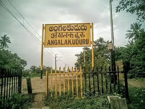 Angalakuduru railway station (station code:AKU[1]) is an Indian Railway station, located in Tenali of Guntur district in Andhra Pradesh. It is situated on Guntur–Tenali section and is administered by Guntur railway division of South Central Railway zone.[2] It is classified as an F-category station in the division.[2]: 11 The station was electrified and a second track was laid, as a part of doubling and electrification works on the Tenali–Guntur section, which was commissioned on 26 April 2019.[3][4]