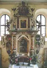 Angel Church is an aisleless church with a straight apse (Schluss) and arched windows. It supports a gabled roof with a flèche that is decorated by a lantern. The interior has a Baroque three-winged altar (probably by a Bohemian master craftsman) dated 1681 to 1692 and by a Baroque baptismal angel, which gives the church its name. The 1846 organ was built by Samuel Heinrich Herold.[1]