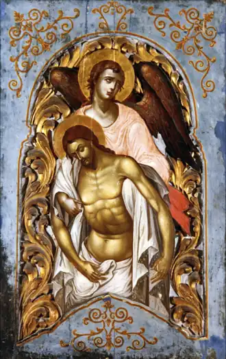 The royal door was made of tempera paint and wood. The work of art features a superlative decorative motif reminiscent of the Rococo style. The angel's flesh tone compared to Jesus's distinguishes the two figures. The pale dead martyr's body rests in the arms of the sullen angel. The work of art is a mixture of Spranger and Backer's masterpieces. The artwork mostly resembles Hendrick Goltzius's engraving.[6] The Heptanese school featured musculature and advanced anatomical interpretation in art. Many artists began to feature more refined subjects with more detail. The human body was realistically presented. Kallergis painted Jesus's biceps and triceps. His abdominal muscle was represented with careful detail. His work resembled realistic anatomical models. The holy shroud features striations to suggest folds of fabric. The artist employed an advanced light and shadow method. Both figures are statuesque. The poses of the figures suggest a grieving event wrought with sorrow and horror. The postures and gestures of both divine beings emit melancholy and sadness. The artist clearly pictorially relays the emotion of the grieving event. The angel gazes at the heavens awaiting instructions.[7][8]