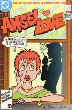 Angel Love is a comic book series created by Barbara Slate, published by DC Comics in the 1980s, as well as the lead character of this series.[2] The first issue was dated August 1986. Despite its cartoony style, and some superficial stylistic resemblance to "girl humor" comic books of an earlier era such as Millie the Model, Patsy Walker, and Katy Keene, it was not intended as a children's comic; it covered "adult" issues such as drug use, pregnancy, and sexual abuse, and did not bear the Comics Code Authority seal.[3] The 1987 Angel Love Special which wrapped up the series bore a "For Mature Readers" advisory on its cover. Nevertheless, its letter column sometimes featured letters from children.
