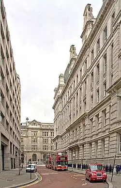 In 1869,[12] work started on a new post office building known as General Post Office (West) to distinguish it from the old General Post Office building on the east side of St Martin Le Grand. It opened in 1874, also becoming the post office's Central Telegraph Office.[13] Following the construction of the telegraph office, Bath Street, later known as Roman Bath Street, was joined to the south side of Angel Street which connected it to Newgate Street in the south. It had formerly been known as Bagnio Court in reference to the Turkish baths that stood there.[14] In 1890, the foundation stone was laid for the construction of a building known as General Post Office (North) which took up the whole of the north side of Angel Street and led to the demolition of the remaining buildings on that side of the street. It was designed by Henry Tanner.[15][16]