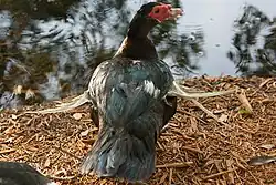 Angel wing, also known as airplane wing,[1] slipped wing, crooked wing, and drooped wing, is a syndrome that affects primarily aquatic birds, such as geese and ducks, in which the last joint of the wing is twisted with the wing feathers pointing out laterally, instead of lying against the body. Males develop it more frequently than females. It has also been reported in goshawks, bustard chicks, and psittacine birds (budgerigars, macaws, and conures).[2]