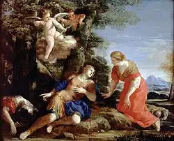 Angelica and Medoro was a popular subject for Romantic painters, composers and writers from the 16th until the 19th century.[1] Angelica and Medoro are two characters from the 16th-century Italian epic Orlando Furioso by Ludovico Ariosto. Angelica was an Asian princess at the court of Charlemagne who fell in love with the Saracen knight Medoro, and eloped with him to China. While in the original work Orlando was the main character, many adaptations focused purely or mainly on the love between Angelica and Medoro, with the favourite scenes in paintings being Angelica nursing Medoro, and Angelica carving their names into a tree, a scene which was the theme of at least 25 paintings between 1577 and 1825.[2]