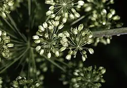 The plant has white to greenish flowers in umbrella-like umbels. One umbel may have as many as 40 branches and be up to 8 in (20 cm) across. Each flower has 5 petals and measures up to 0.25 in (0.64 cm).[5]