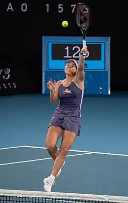 At the start of the 2017 season, Kerber competed at the Brisbane International as the top seed, and won her opening match against Ashleigh Barty in three sets but then lost to Elina Svitolina in the quarterfinals.[145][146] The following week in Sydney, she dropped opening match to Daria Kasatkina.[147] As the top-seeded player and defending champion at the Australian Open, Kerber overcame a mid-match lapse to see off Lesia Tsurenko in the first round, where she squandered a match point in the second set.[148] Kerber then defeated compatriot Carina Witthöft in the second round and Kristýna Plíšková in the third round. In the fourth round, Kerber lost to eventual semifinalist CoCo Vandeweghe in straight sets.[149] Serena Williams, who lost to Kerber in the championship match here 12 months ago, won the tournament this time and amassed enough points to take back the top ranking from Kerber.[6]