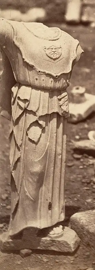 The statue is heavily damaged and has lost its head. Like earlier depictions of Athena she wears the archaic peplos, but she also has the aegis over her shoulders, with a gorgoneion in the centre of her chest. Her upraised right arm survives up to the wrist and once held a spear. Her left arm is entirely missing except for the shoulder and traces of her left hand resting on her waist.