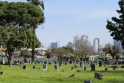 Located in the West Adams neighborhood of Los Angeles,[1][2][3][4] the cemetery was founded as Rosedale Cemetery in 1884,[5] when Los Angeles had a population of approximately 28,000,[6] on 65 acres (260,000 m2) of land running from Washington to Venice Boulevard (then 16th Street) between Normandie Avenue and Walton and Catalina Streets. It is often used by California politicians, notably former Mayors of the City of Los Angeles.The interments include pioneers and members of prominent families in Los Angeles and the state.