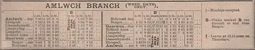 The timetable for January 1883 shows a variety of passenger, goods and mixed trains, giving five passenger services down to Amlwch, and six up. The first train of the morning, departing Bangor at 04:20, and the 19:35 from Amlwch also carried mail to and from the island. The majority of trains still terminated at Gaerwen.[25] As Llangefni held a livestock market on a Thursday,[26] an extra service from Bangor to Llangefni on Thursdays was introduced by the 1896 timetable.[27]
