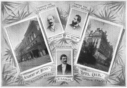 The third match was held 18–19 March 1898. The United States team had white on the odd-numbered boards and the British team had white on the even-numbered boards. The British team won the match by a single game, taking the lead in the series two matches to one, and positioning themselves to end the series and take permanent possession of the Newnes cup should they win the 1899 match for three consecutive match wins.[8] The British players were at the Grand Hall of the Hotel Cecil in London, along with Leopold Hoffer serving as the umpire for the American team.[9] The American players were at the Academy of Music in Brooklyn, with Isaac Rice serving as umpire for the British team.[9] World Champion Emanuel Lasker was the adjudicator, and for the third time Baron Albert von Rothschild was the referee.[9] The moves were transmitted by the Commercial Cable Company.[9]