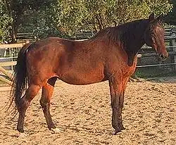 Representatives of the breed may have between 25 percent and 75 percent Thoroughbred blood. The Anglo-Kabarda is divided into three different types: "basic," "oriental" and "massive." Horses belonging to the basic type are of medium size with a well-shaped head and are well muscled; those of the oriental type are smaller and lighter, they have smaller heads with large expressive eyes and smaller ears and clean legs; the massive type are heavier and taller with a build similar to carriage horses. These horses usually stand between 15.2 and 16 hands (62 and 64 inches, 157 and 163 cm) tall. They have legs which are long and strong with well-developed joints giving them the speed of the Thoroughbred and the resistance of the Kabarda. The breed's temperament is considered spirited and energetic but very reliable.[1] This breed is generally hardy, although due to the Thoroughbred blood, they may not necessarily be easy keepers and may require some supplemental nutrition.[2]