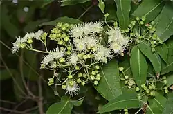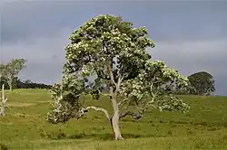 Angophora subvelutina, commonly known as the broad-leaved apple,[2] is a species of tree that is endemic to eastern Australia. It has rough bark on the trunk and branches, lance-shaped to egg-shaped or elliptical adult leaves, flower buds in groups of three or seven, white or creamy white flowers and ribbed, cup-shaped fruit.