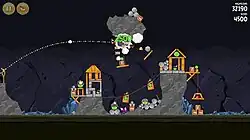 A fifth episode, called "Ham 'Em High", launched on December 23, 2010, in celebration of the game's first year on the iOS App Store.[45][49] "Ham 'Em High" contained 15 American Old West-themed levels in a single chapter;[50] updates on February 4, 2011[51][52] and March 17, 2011[53][54] each added one new 15-level chapter. "Ham 'Em High" also introduced the Mighty Eagle, a new bird that may be used once per hour to clear any uncompleted levels.[50] The Mighty Eagle can also be used in previously completed levels, without the once-per-hour limit, to play a mini-game called "Total Destruction" in which the player attempts to destroy as much of the scenery as possible, both with the standard birds and the Mighty Eagle, achieving 100% destruction earns the player a Mighty Eagle feather for the level.[50]
