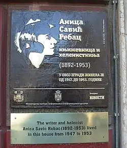 Anica Savić-Rebac (Serbian Cyrillic: Аница Савић-Ребац; 4 October 1892 — 7 October 1953) was a Serbian writer, classical philologist, translator, professor at the University of Belgrade.[1] She wrote a number of essays and books about Njegoš, Goethe, Sophocles, Spinoza, Thomas Mann, Greek mystical philosophers, Plato, theory of literature.[2][3] She also translated a number of works from Serbian into English, most notably The Ray of the Microcosm by Petar II Petrović-Njegoš.