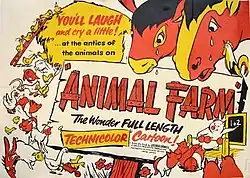 Animal Farm is a 1954 animated drama film directed and produced by John Halas and Joy Batchelor and funded in part by the Central Intelligence Agency (CIA), who also made changes to the original script.[7][8][9] Based on the 1945 novella Animal Farm by George Orwell, the film features narration by Gordon Heath, with the voices of all animals provided by Maurice Denham.[10]