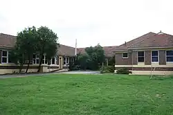 The main facade of the building looks to the east and a grassed area where a large, circular garden bed formed by concrete edging is positioned. Its shape and extent are significant but not the edging. In its centre is a steel flagpole dating from the period of the School's occupation during WWII. The building wings facing to the west enclose a small courtyard which has large sections of concrete pathway and some plantings, none of which are significant.[1]