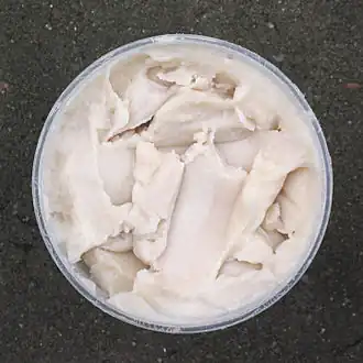 Animal fats are lipids derived from animals which are used by the animal for a multitude of functions, or can be used by humans for dietary, sanitary, and cosmetic purposes. Depending on the temperature of the fat, it can change between a solid state and a liquid (oil) state. Chemically, both fats and oils are composed of triglycerides.[2][3] Although many animal parts and secretions may yield oil, in commercial practice, oil is extracted primarily from rendered tissue fats from livestock animals like pigs, chickens and cows. Dairy products yield animal fat and oil products such as butter.