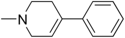 1-Methyl-4-phenyl-1,2,3,6-tetrahydropyridine (MPTP) is a widely used neurotoxin in Parkinson's disease research (Figure 4). In contrast to 6-OHDA, MPTP crosses the BBB which making the neurotoxin even more selective for dopaminergic neurons. Due to the ability to cross the blood-brain-barrier, MPTP is administered peripherally, subcutaneously. This neurotoxin is known to replicate oxidative stress, ROS, energy failure, and inflammation; which are all hallmarks in Parkinson's disease. However, it does not produce Lewy body pathology. The mechanism of action of MPTP is due to its conversion to 1-methyl-4-phenylpyridinium (MPP+) caused by the interaction of MPTP with monoamine oxidase B (MAO-B). (Figure5). MPTP enters astrocytes and is metabolized to MPP+ before being released. Once released into the extracellular space, MPP+ is taken up into the neuron by DAT and is stored in vesicles by the up take of vesicular monoamine transporter (VMAT2). In the neuron, MPP+ inhibits the function of complex 1 of electron transport chain, which decreases ATP production and releases ROS.