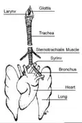 When birds inhale, air is passed from the mouth, through the trachea, which forks into two bronchi connecting to the lungs.[8] The primary vocal organ of birds is called the syrinx, which is located at the fork of the trachea, and is not present in mammals.[9] As air passes through the respiratory tract, the syrinx and the membranes within vibrate to produce sound.[10] Birds are capable of producing continuous song during both inhalation and exhalation, and may sing continuously for several minutes.[11] For example, the skylark (Alauda arvensis) is capable of producing non-stop song for up to one hour.[12] Some birds change their song characteristics during inhalation versus exhalation. The Brewer's sparrow (Spizella breweri) alternates between rapid trilling during exhalation interspersed with lower-rate trills during short inhalations.[13] The two halves of the syrinx connect to separate lungs, and can be controlled independently, allowing some birds to produce two separate notes simultaneously.[9]