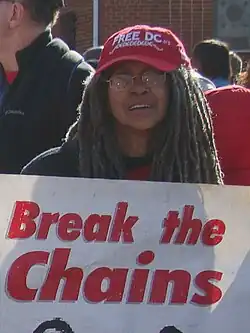 Jenkins is also notable for her appearance at rallies and protests in relation to D.C. statehood and is distinctive for her long dreadlocks hair style covered by a red or black baseball cap emblazoned with the "FREE DC" slogan.[2][1]