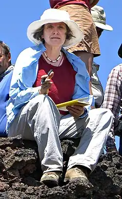 Grunder is a field geologist who has worked on volcanoes and volcanic rocks in a variety of locations including Nevada,[7] Oregon,[8][9] and the Aucanquilcha region in Chile.[10] Her early research was on the volcanic rocks[11][12] and hydrothermal system[13] at Calabozos crater in the Chilean Andes. She uses oxygen-18 isotopes in different types of rocks to reveal changes in magmatic activity over millions of years.[7][12] In 2005, Grunder co-edited a collection of articles on welding processes in volcanic systems,[14] and contributed an article on welded pyroclastic deposits from Oregon.[15] In Hawaii, she worked on the sulfur dioxide released by the Kilauea volcano and collaborated with a graduate student working in public health, Bernadette Longo, to reveal increased health issues for people living downwind of the volcano.[16][17] In 2020 she examined the geology of the volcanic material in the area surrounding Steens Mountain in southeastern Oregon.[18] One of her students described her skills at explaining volcanic processes and noted that she is adept at making geology interesting to a range of people, both inside and outside academia.[19]