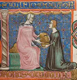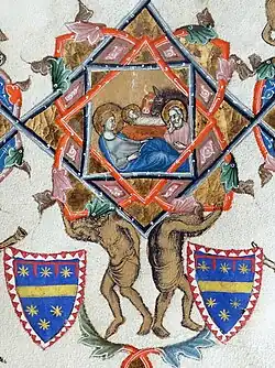 Earlier studies suggested that the intended recipient of the Bible was Nicolo d'Alifio, advisor of Robert and Joanna, whose coat of arms frequently appears throughout the Bible.[11] The Bible likely came into his possession as a gift from Queen Joanna[10] when she fled to France in 1345. An explicit mention of Nicolo can be found at the end of the manuscript, on folio 309r in the text surrounding the painted miniature: "Hec est Blibia [sic] magistri Nicolai de Alifio doctor quam illuminavit de pincello Cristophorus Orimina de Neapoli".[note 2][12] His coat of arms is painted more than one hundred times over the original coats of arms in the lower border of the miniatures.[11]