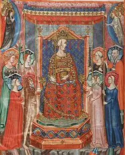 In the right miniature, a family tree emphasizes dynastic greatness. At the top are Charles I of Anjou and his spouse Beatrice of Provence, the founders of the Capetian House of Anjou in Naples and Sicily. He is surrounded by armored Neapolitan barons. Kneeling at his feet is his son and successor, the future Charles II. In the middle field of the miniature, Charles II and Maria of Hungary are depicted. Next to Maria are her daughters, and next to Charles II is Charles Martel, his eldest son, and a bishop with a halo, Saint Louis of Toulouse, his second son. Next to them is Robert I of Anjou in royal dress; kneeling at his feet are his two granddaughters, Joanna (who succeeded him) and her sister Maria. At the bottom of the third part of the miniature are Robert I of Anjou and his second wife Sancia of Majorca. To the left of the queen is Maria of Valois, Duchess of Calabria, with her two daughters, Joanna and Maria. Next to Robert is his son Charles of Calabria. This miniature illustrates the succession within the Angevin dynasty, and makes it clear that Robert had chosen his granddaughter Joanna to succeed him after the death of his son.[13]