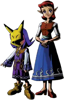 Anju and Kafei appear in the 2000 video game The Legend of Zelda: Majora's Mask, a game that operates on an in-game three-day time limit (54 minutes in real time) that can be looped.[5][6] The actions of multiple involved characters are on a schedule, meaning that players in control of Link must complete their quest - the Testament of Love - on a schedule, and thus can fail the quest.[7] Their quest takes place across the entire three days span of time, and is the longest quest in the game.[8][6] Anju is a worker at an inn, while Kafei is the son of the mayor.[8] They were betrothed, but the mask Kafei was going to give Anju as part of a marriage ceremony was stolen, on top of Kafei being turned into a child by the game's antagonist, Skull Kid.[6][8] Ashamed, Kafei went into hiding until he could retrieve the mask from the thief. Meanwhile, Anju continued working at the inn, worried about Kafei.[6][9][10] Link becomes involved after agreeing to help search for Kafei.[11]