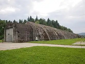 The tunnels were surrounded by barracks, personnel bunkers, and watchtowers. Other buildings were used for operations, administration, and maintenance. Inside each bomb-proof tunnel, there was a rail track and a platform.[3] The tunnel portals were protected by two-wing armoured doors with firing embrasures for the guards.[3] Purpose-built track connected the tunnels with the Rzeszów-Jasło railway.[4]