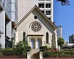 During the mid 1960s, the future of the church was threatened when the Brisbane City Council sought to acquire the site as part of the redevelopment of King George Square. Church and community pressure, however, ensured the survival of the building,[1] although the extension was subsumed in the construction of 145 Ann Street, King George Central.[10][11]