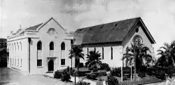 In September 1854, the congregation purchased three allotments in Ann Street.[2] Four years later, a simple stone building in the Gothic style was erected by Joshua Jeays for a cost of £960. It was 36 by 47 feet (11 by 14 m).[3] The church was opened on Sunday 25 July 1858 and became known as the Ann Street Presbyterian Church.[4][5] On Thursday 21 December 1871, a fire destroyed all but the stone walls of the church, which was not insured.[6]