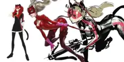 Ann Takamaki was created for Persona 5 by Shigenori Soejima who uses the Phantom Thief nickname Panther to hide her identity.[1] Director Katsura Hashino discussed how she has a foreign air to her that gets attention, but also makes her unapproachable.[2] Ann's Phantom Thief alter ego was always intended to be feline-like. Her Phantom Thief outfit consists of a skin-tight red latex catsuit with a cleavage cutout and zippers, a matching red panther mask, pink gloves, and a clip-on tail on the back of her catsuit. For her footwear, she wears dark red thigh-high boots. Unlike the current red catsuit with a matching cat mask, she was originally going to have a black dress, goggles, a tail, and thigh-high socks. Her next design was more similar to her final design, still featuring goggles and wearing a black catsuit. She lacked a cleavage window in her catsuit and wielded a crossbow instead of a whip.[1] Ann initially gains the Persona Carmen, which eventually transforms into Hecate. The designers noted that the male characters' Personas were comparatively well-known versus female characters' Personas. They felt that if all of them were based on famous gods it would be lacking in depth, so some were made obscure, including Hecate. They still made a point of ensuring that Hecate was a good fit with Ann's personality, however.[3]