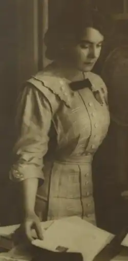 From 1909 until her marriage in 1924, she maintained a studio and gallery in midtown Manhattan. Her longtime address was 5 East 35th Street, where she used Irish turf as fireplace fuel and welcomed anyone interested in Irish culture, industry, history and independence campaigns.[12] Her office was also the headquarters of the Levins Press. She hosted lectures and concerts at her office and at the Waldorf-Astoria for a group she founded, the American Daughters of Ireland, and for the Gaelic League. Performers, authors, politicians and religious leaders gathered at her office and posed for her paintings and photos. Known as “the Irish-American Image-Maker,[13]” she developed “the reputation of having photographed more celebrities than any other woman in the business.”[10] She had her clothing made from Irish textiles and urged Americans to support Irish independence, battling against “the whole machinery of English tyranny.”[14] She served as the American Irish Historical Society's official photographer and its executive council's only woman.[15] She traveled to photograph in Newfoundland and remote parts of Ireland, and on the lecture circuit for her work she was known as “the most Irish travelled woman in the world."[16]