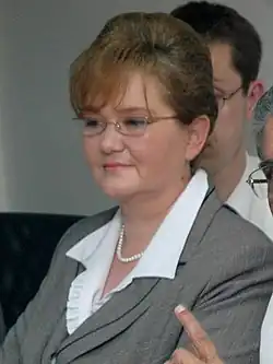 Anna Kalata (born 10 May 1964, Milanówek, Poland) is a Polish politician, celebrity and occasional actress. She was a member of the populist Samoobrona party.[1] In Jarosław Kaczyński's cabinet she was the minister of labour and social policy.[2] She participated in the 12th season of Taniec z Gwiazdami (the Polish version of Dancing With The Stars).[3] After losing 38 kilograms (84 lb) she appeared on the cover of Shape magazine.[4]