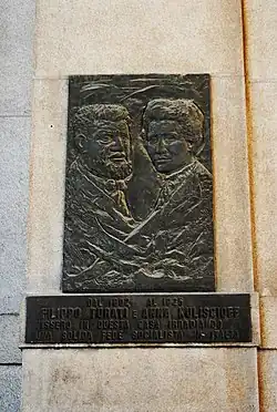 After being expelled from France in 1878, she settled in Italy and became the editor of Critica Sociale, a major socialist paper, in 1891. An activist for causes such as women's suffrage, Anna Kuliscioff was tried and imprisoned on several occasions. Her views on Marxism influenced Filippo Turati, who became her partner.[6] Together, they contributed to the creation of the Italian Socialist Party (PSI) as leaders of a reformist wing that came to oppose both Communism (causing the split of the new Italian Communist Party in 1921) and the irredentist attitudes of Benito Mussolini (who subsequently left the PSI). Their group was itself expelled from the PSI later in 1921, leading to the creation of a Unitary Socialist Party (PSU) – led by Turati, Kuliscioff, and Giacomo Matteotti, in opposition to the emergence of Fascism.[7]