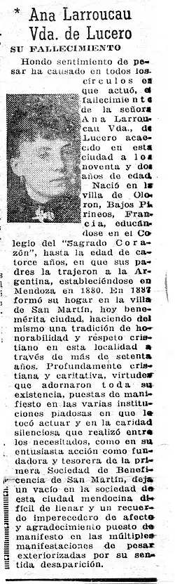 Anna Larroucau Laborde de Lucero (March 7, 1864 – September 3, 1956) was a French-Argentine philanthropist and educator. Pioneer of the Argentine grape and wine industry. She was born in Oloron-Sainte-Marie, France, more precisely in the district of Sainte-Croix, Oloron, rue Mercière Nº13, (erstwhile called rue Centule). She died in San Martín, Mendoza, Argentina.