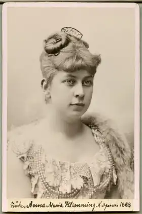 Anna Maria Klemming (1864–1889) was a Swedish operatic soprano who made her debut in April 1887 at the Royal Swedish Opera as Mathilde in Rossini's William Tell. Over the next two years, thanks to her clear, high-reaching voice and her attractive Nordic looks, she performed the leading soprano roles in the company's repertoire. She was particularly successful in 1888 as Julia in Gounod's Roméo et Juliette. Her successful career was short, ending abruptly with her untimely death in August 1889.