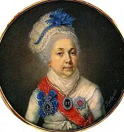 After the death of Catherine the Great, Paul I appointed her Ober-Hoffmeisterin in memory of her service to the court of his father. She was the first courtier to wear the insignia on the right side of her body. Due to her old age, she could not attend the coronation, regardless, she was granted the Order of Saint Catherine first class, and later send miniature portraits of himself and his wife for her to wear.