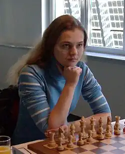 Muzychuk was awarded the titles of Woman FIDE Master (WFM) in 2001 and Woman International Master (WIM) in 2002.[20] She earned her first FIDE rating of 2197 in July 2001 at age 11.[21] She first participated at the European Individual Women's Championship in 2002 at age 12, and finished with at least an even score in her first three appearances through 2004.[22][23][24] Her performance at the 2003 edition as well as a joint first-place finish at the 17-round Lviv's Hopes tournament later in the year helped Muzychuk reach a rating of 2300 by October 2003.[21][25][26] She also earned a sufficient number of Woman Grandmaster (WGM) norms at these two tournaments, and was formally awarded the WGM title in 2004.[20][27] At the end of June 2004, Muzychuk switched federations to Slovenia.[28] Her 2004 European Youth gold and World Youth silver medals were among her earliest triumphs with Slovenia.[12][19]